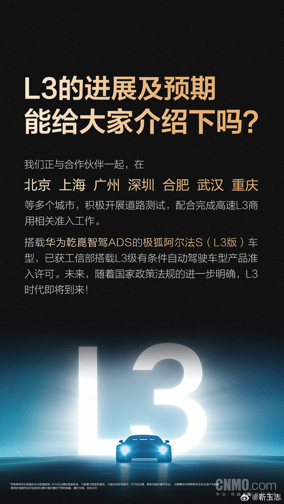 针对L3的进展及预期,靳玉志表示,华为正与合作伙伴一起,在北京、上海等多个城市,积极开展道路测试,配合完成高速L3商用相关准入工作。搭载华为乾崑智驾ADS的极狐阿尔法S(L3版)车型,已获工信部搭载L3级有条件自动驾驶车型产品准入许可。