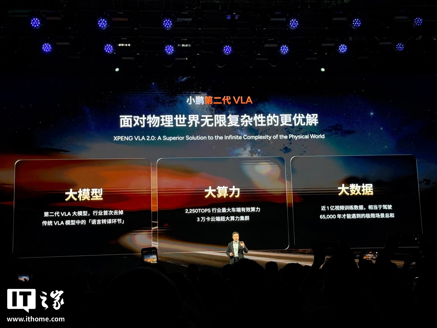 小鹏的第二代 VLA 宣称行业首次去掉传统 VLA 模型中的“语言转译环节”,搭配 2250TOPS 行业最大车端有效算力、3 万卡云端算力集群,以及近 1 亿视频训练数据(相当于驾驶 65000 年才能遇到的极限场景总和)。