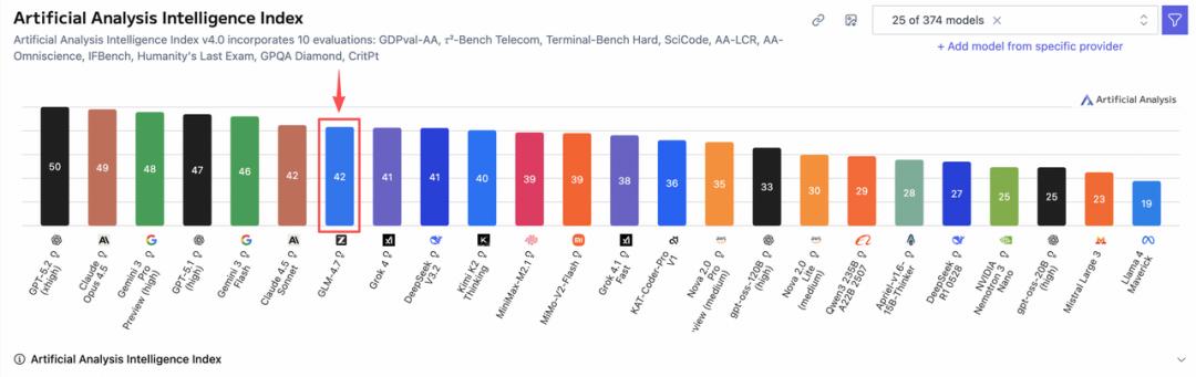 12月,在模型综合能力榜单Artificial Analysis中,GLM-4.7获得开源模型与国产模型双料榜首。