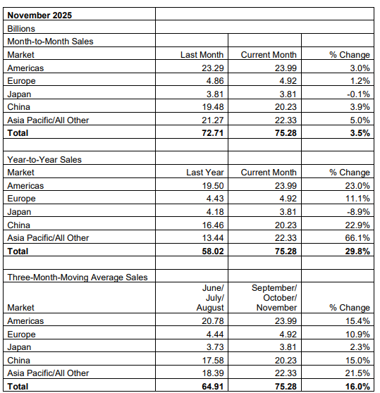 美国半导体产业协会(SIA)最新公布的统计数据显示,2025年11月全球半导体行业销售额达753亿美元,较2024年11月的580亿美元增长29.8%,较2025年10月的727亿美元增长3.5%。
