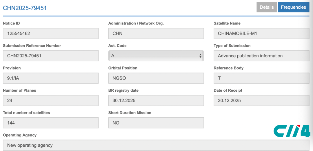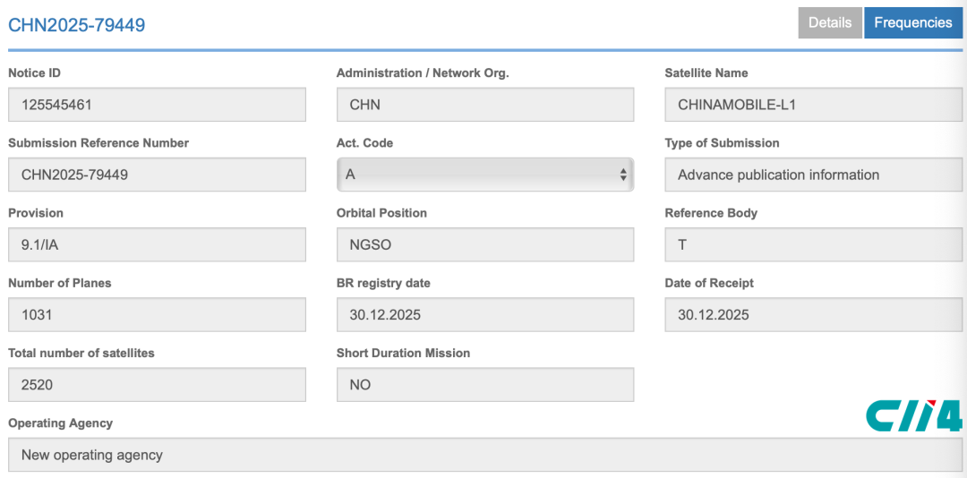 其中,中国移动申报了两个星座:分别被命名为CHINAMOBILE-L1,规模为2520颗(编者注:低轨);CHINAMOBILE-M1,规模为144颗(编者注:中轨)。两个星座总计为2664颗卫星。