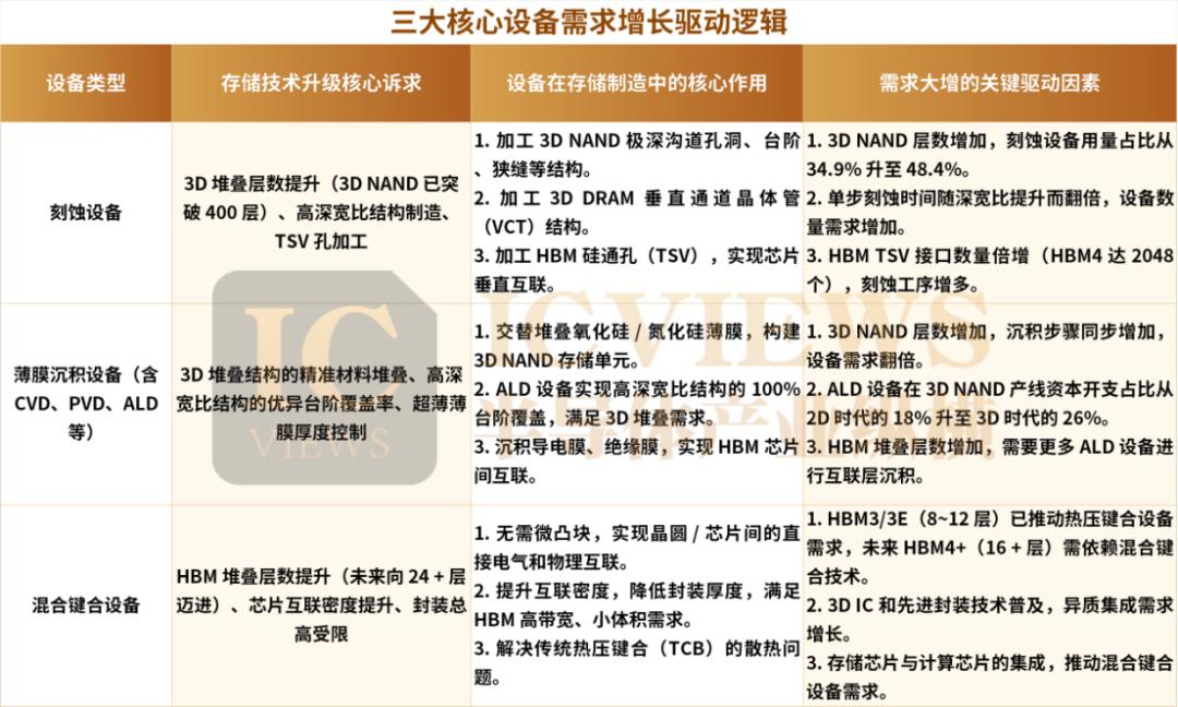其中 3D NAND扩产、DRAM技术演进对刻蚀/沉积设备拉动最强,HBM扩产则额外提升光刻、ALD、混合键合等设备需求。