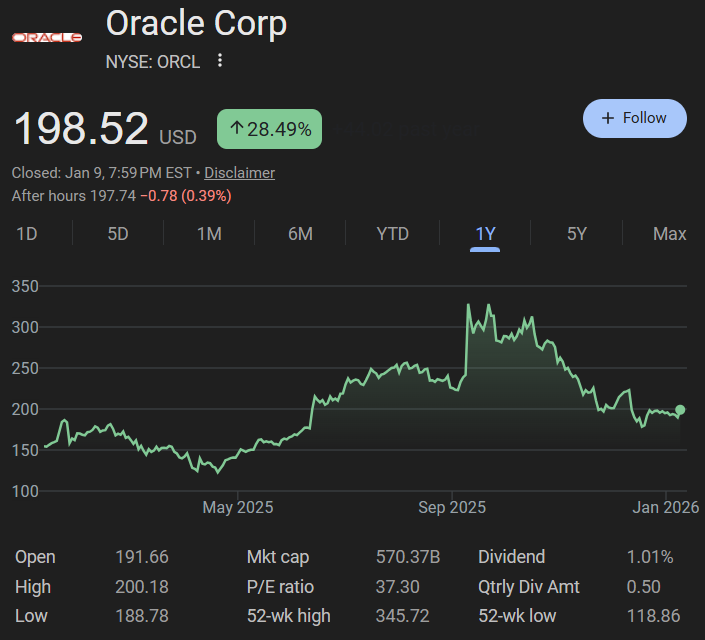 相比9月份的峰值,甲骨文去年的收盘价已回撤约40%。