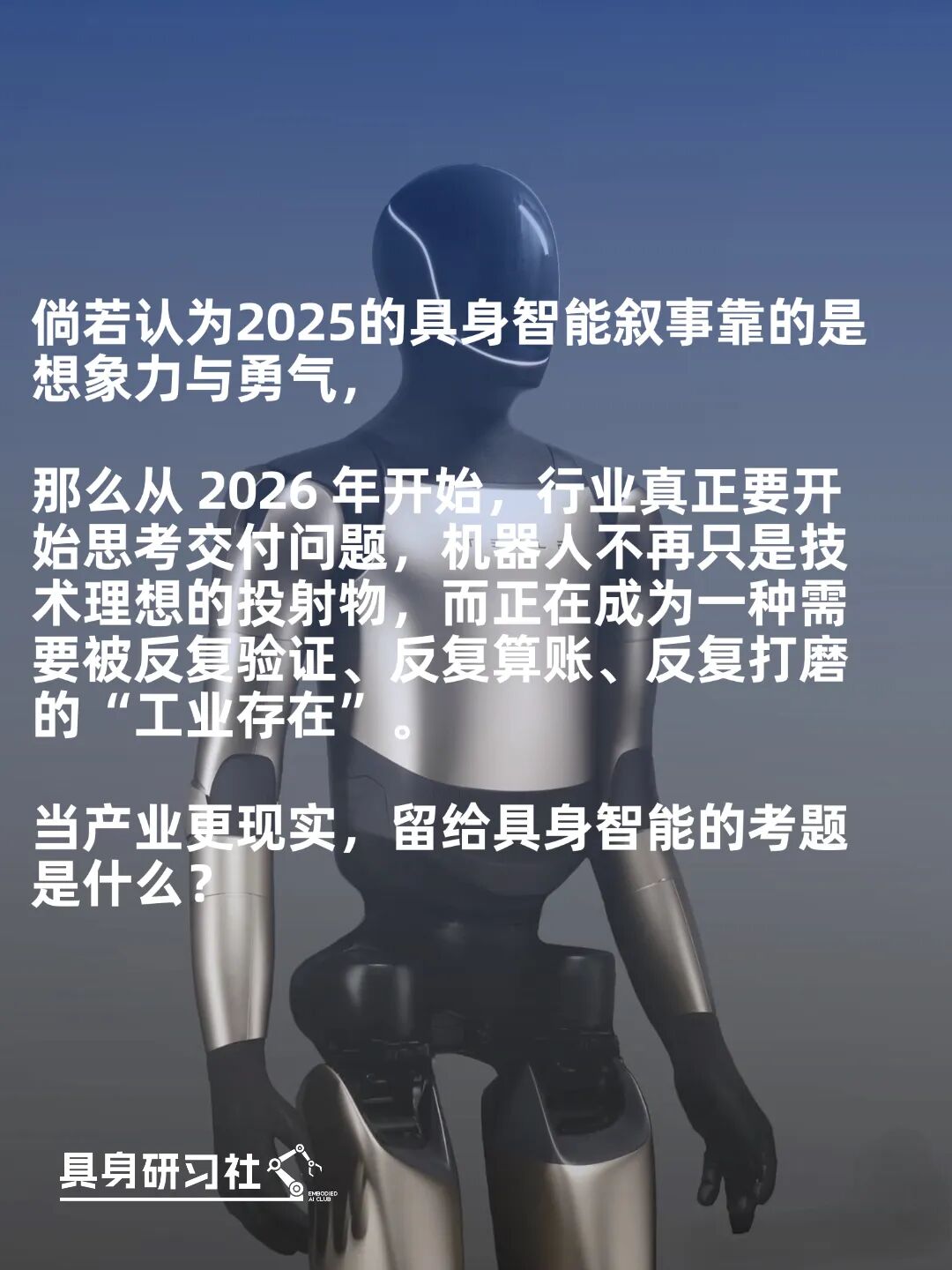 倘若认为2025的具身智能叙事靠的是想象力与勇气,那么从 2026 年开始,行业真正要开始思考交付问题,机器人不再只是技术理想的投射物,而正在成为一种需要被反复验证、反复算账、反复打磨的“工业存在”。在新的一年征程中,有人可能继续沉迷于浪潮的声势中,有人或许开始低头修船、校准航向,而最终抵达彼岸的,从来不是喊得最响的那一群,而是最早意识到陷阱并规避掉的那群务实者。