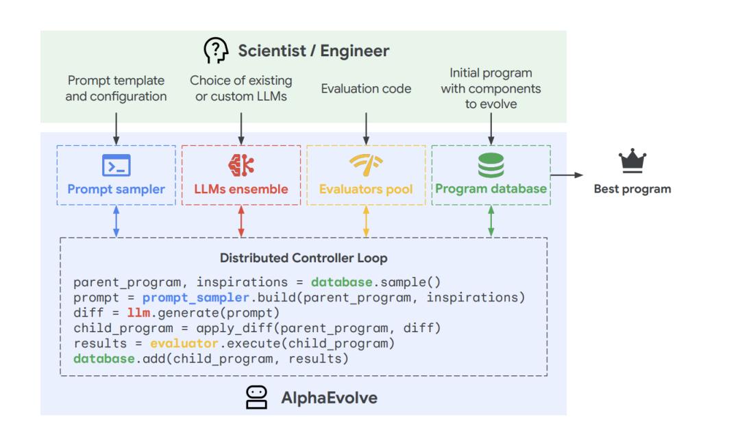 它是由系统使用Gemini Flash(追求速度)和Gemini Pro(追求深度)组成的模型集成,形成一个个独立的探索Agent。系统将当前表现最好的算法代码作为上下文输入LLM,并告诉这些Agent,去优化这段代码的某些具体方向。LLM由此生成多个变异版本的代码。在Agent规则的限制下,这些变异一般是逻辑层面的重构,例如改变循环结构、引入新的数学技巧或调整数据结构。生成的代码会被放入沙箱环境中执行。系统通过预定义的测试用例验证其正确性(Provable Correctness),并通过性能分析器测量其效率(如延迟、吞吐量或指令数)。那些既正确又更高效的算法将被保留,成为下一代的父本。由此,持续的多次优化,最终带来算法的最优优化。