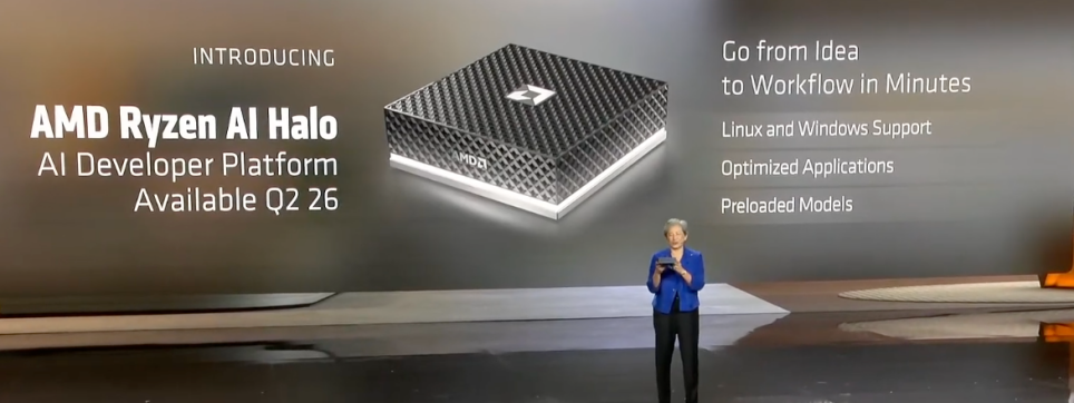 为满足AI开发者随时开发的需求,苏姿丰海宣布AMD推出Ryzen AI Halo参考平台——这是世界上最小的AI开发系统,可在本地运行参数高达2000亿的模型,无需连接任何外部设备。该平台搭载最高端Ryzen AI Max处理器,配备128GB高速统一内存(CPU、GPU和NPU共享),在提升性能的同时,能够实现大型AI模型在紧凑型台式电脑上的高效运行;原生支持多种操作系统,与最新ROCm软件栈同步,预装领先开源开发者工具,开箱即可运行数百个模型,为开发者提供在PC上直接构建、测试和部署本地代理及AI应用程序的全套能力,将于今年第二季度发布。
