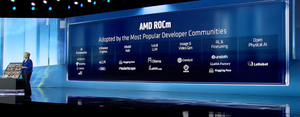苏姿丰介绍,AMD的软件战略以ROCm为核心,这一业界性能最高的开源AI软件栈,为最常用的框架、工具和模型提供Day0支持,同时原生支持PyTorch、VLLM、SGLang、Hugging Face等顶级开源项目(每月下载量超1亿次),且可在Instinct加速器上开箱即用,大幅降低开发者在AMD平台构建、部署和扩展AI能力的门槛。