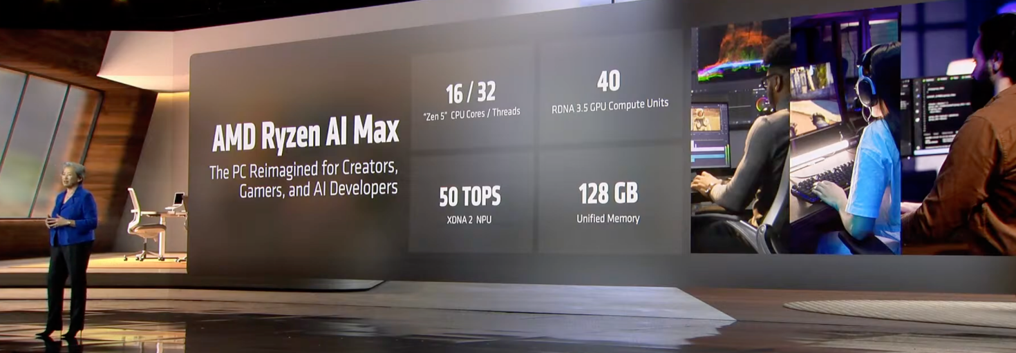 在苏姿丰看来,AI PC不仅能运行AI程序,还能构建程序,这正是AMD打造Ryzen AI Max的初衷——该处理器面向内容创作者、游戏玩家和AI开发人员,配备16个高性能Zen 5 CPU核心、40个RDNA 3.5 GPU计算单元和1个XDNA2 NPU,具备50 TOPS AI性能,通过统一内存架构连接,支持CPU和GPU共享128GB内存。