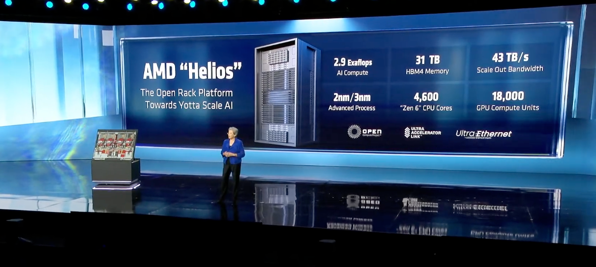 正如苏姿丰所言,Helios是一个“性能猛兽”。每个Helios机架拥有超过18000个CDNA5 GPU计算单元和4600个Zen 6 CPU核心,可提供高达2.9 Exaflops的性能、31TB的HBM4内存、每秒258TB的纵向扩展带宽和每秒43TB的横向扩展带宽,从而支持数据快速传输。