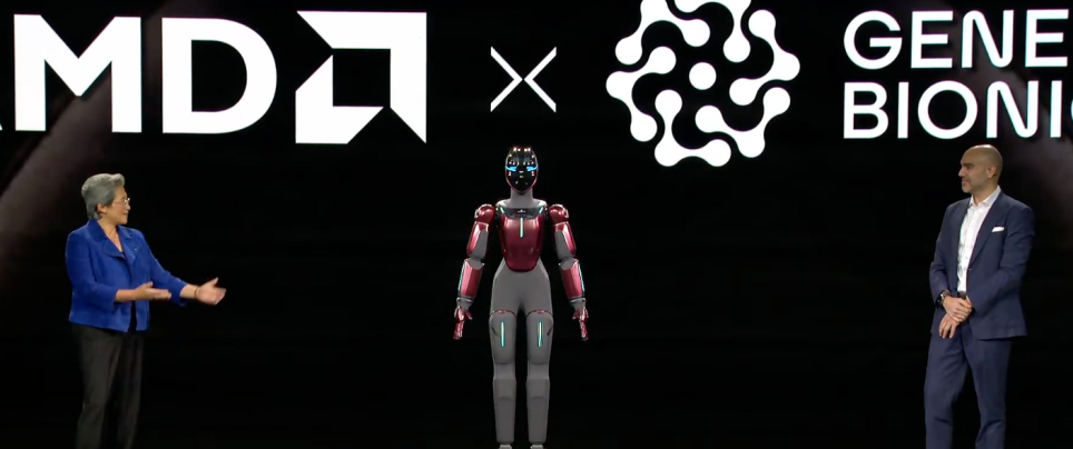 Generative Bionics CEO兼联合创始人Daniele Pucci分享了物理AI在仿生学领域的应用。该公司拥有20多年物理AI和生物力学研究经验,专注于生成式仿生学,需要快速、确定性和本地化的计算支撑触觉、平衡等功能,无法依赖云端——这正是与AMD合作的核心原因。AMD提供了从嵌入式边缘平台(Ryzen AI Embedded、Versal AI Edge)到CPU、GPU的全栈解决方案:嵌入式平台可在机器人上运行物理AI,CPU和GPU则为仿真、训练和大规模开发提供算力。