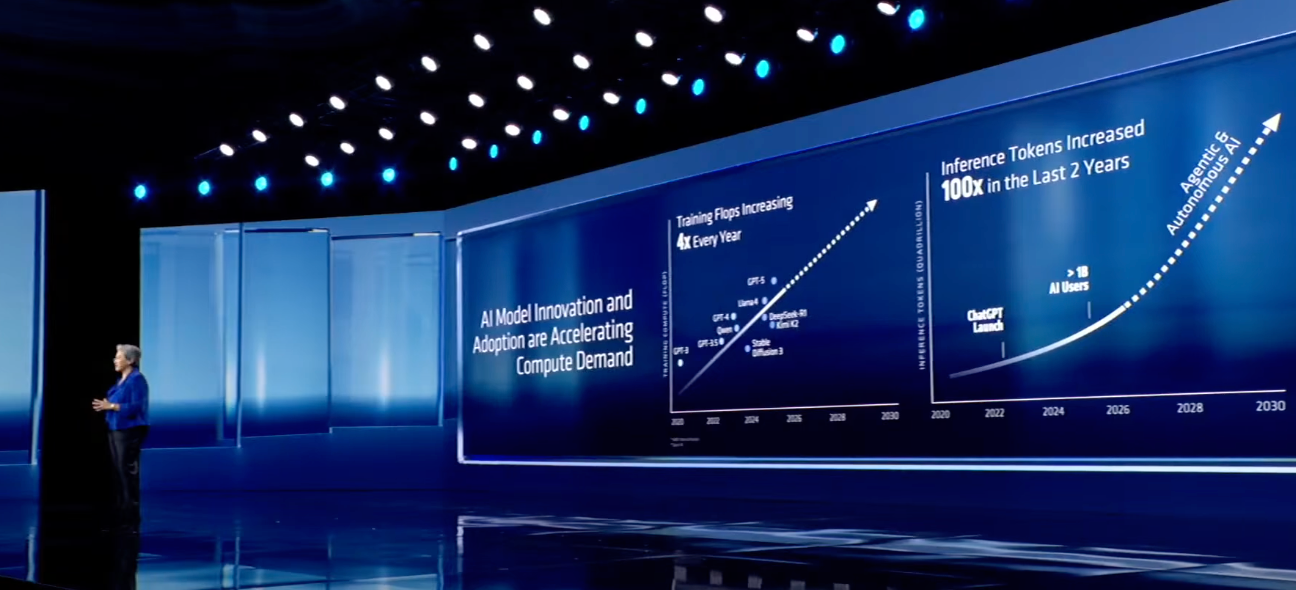 强大的大模型需依托云端算力运行,如今,AMD已成为云端算力的核心支撑力量。目前,所有主要云服务商均采用AMD EPYC CPU,排名前10的AI公司中有8家使用Instinct加速器驱动最先进的模型。而算力需求仍在持续飙升:过去十年,训练领先AI模型所需的计算能力每年增长4倍;过去两年,随着AI用户激增,推理能力呈现爆发式增长,Token数量实现了百倍的增长。