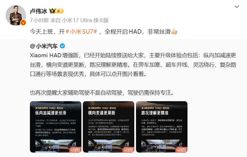 1月12日,卢伟冰转发了小米汽车动态,并配文称“今天上班”,用上班动态辟谣离职传闻。