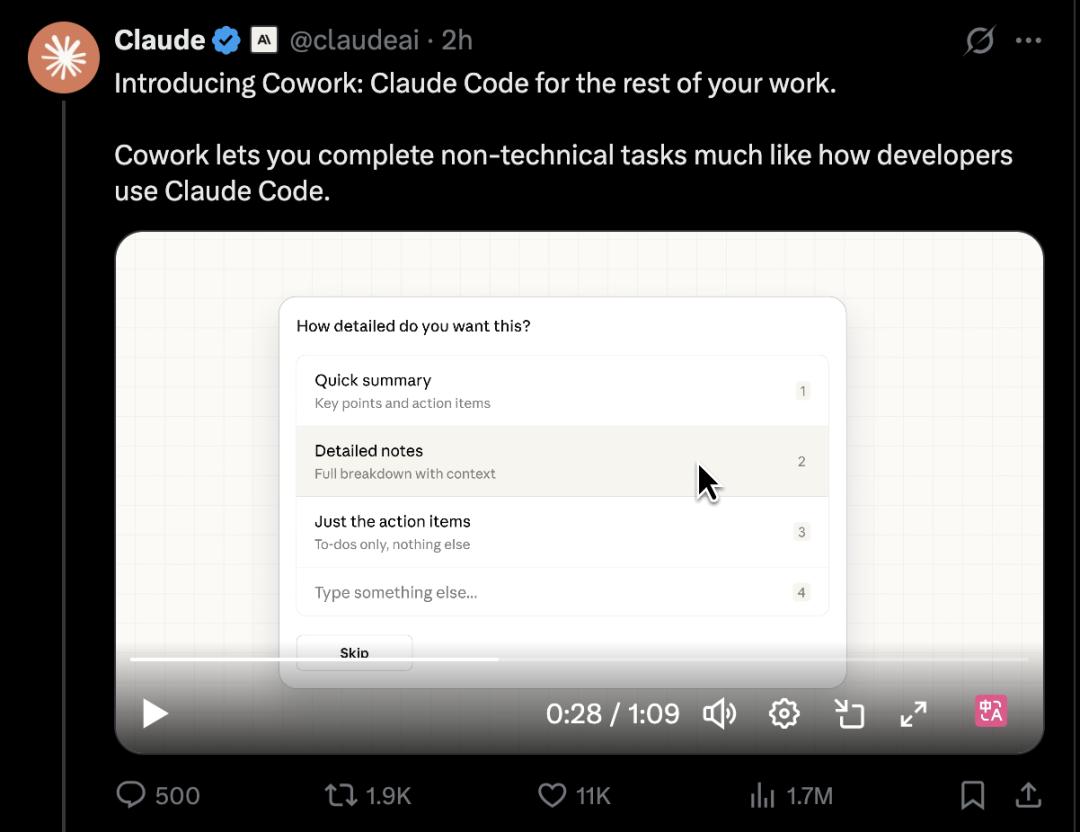在 Cowork 发布之后,迅速在开发者社区、AI 产品圈以及更广泛的知识工作者群体中引发讨论。与以往单纯围绕模型能力、跑分或价格的争论不同,这一次的焦点明显转向了一个更现实的问题:“AI 是否真的开始成为一个可以被信任、被授权的工作参与者?”