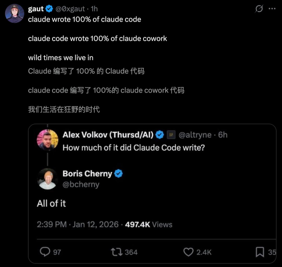 Claude之父爆出,Claude Code写了100% Cowork的代码,简直太疯狂。