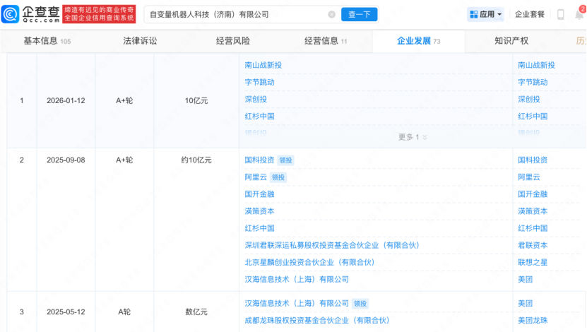 技术上的领先,让自变量获得了资本市场的青睐。企查查信息显示,自变量机器人已累计获得9次融资,融资至A++轮,其中更有2025年5月美团独投的数亿元A轮融资,以及9月份阿里云的参投。
