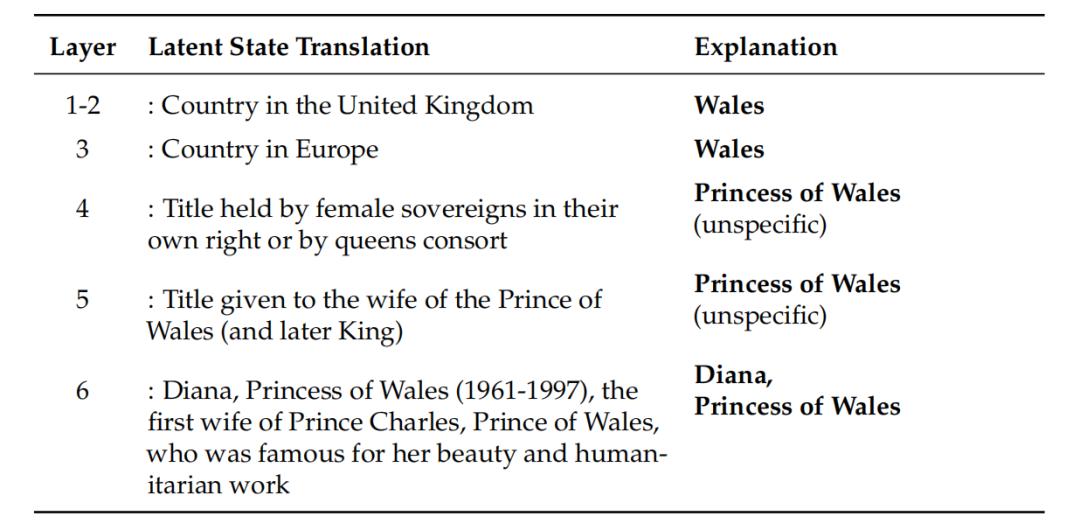 论文用了一个更具体的例子:当模型遇到「Diana, Princess of Wales」时,需要消耗前 6 层网络才能完成识别。第 1 到 2 层只能理解这是「Wales」,第 3 层才意识到这是「Princess of Wales」,直到第 6 层才最终确认这是「戴安娜王妃」。