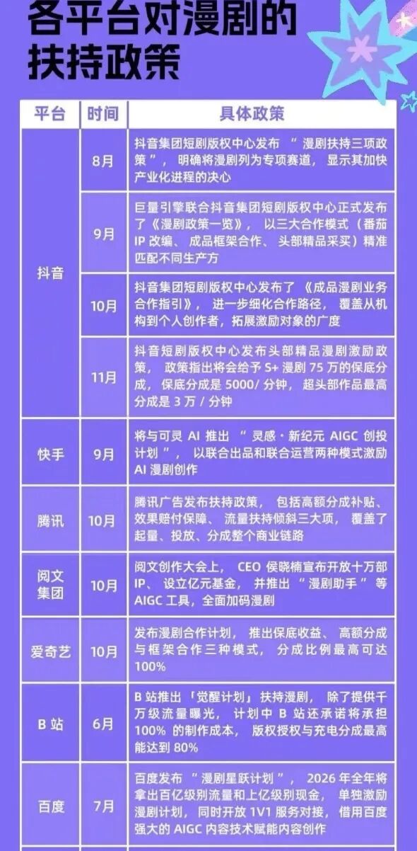 可见,无论是流量型平台、内容型平台还是技术型平台,都在以各自优势切入漫剧赛道,试图在这场由AI驱动的内容产业变革中占据先机。