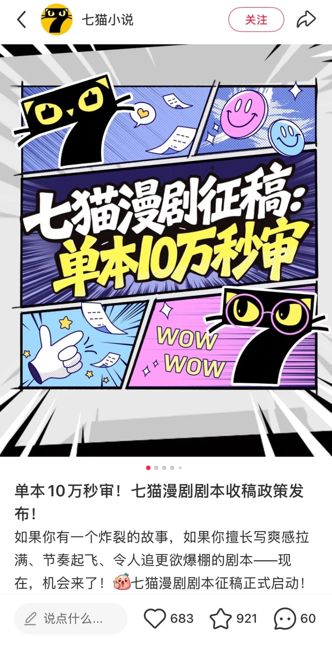 七猫漫剧的打法与之形成呼应,不仅开放全部IP的漫剧改编权,还推出分级稿酬政策。目前七猫漫剧S+级剧本保底稿酬5-10万元,最高可获20%收益分成,同时面向全网征集剧本,形成“IP供给-创作者集聚-内容产出”的正向循环。