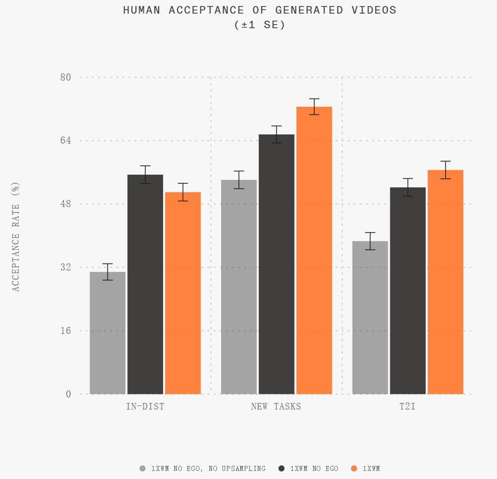 基于此前假设:生成视频的质量与任务成功率之间存在相关性,研究团队对若干训练选择进行了视觉层面的消融分析,重点考察了字幕上采样以及第一视角人类数据训练这两项因素的影响。