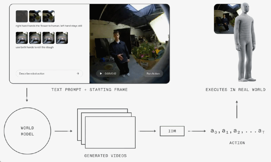 在推理阶段,系统接收一个文本指令和一帧初始画面:世界模型负责生成符合意图的未来场景演化,逆动力学模型从中提取所需的动作轨迹,最终由机器人在现实世界中执行该动作序列。