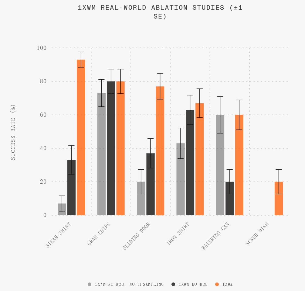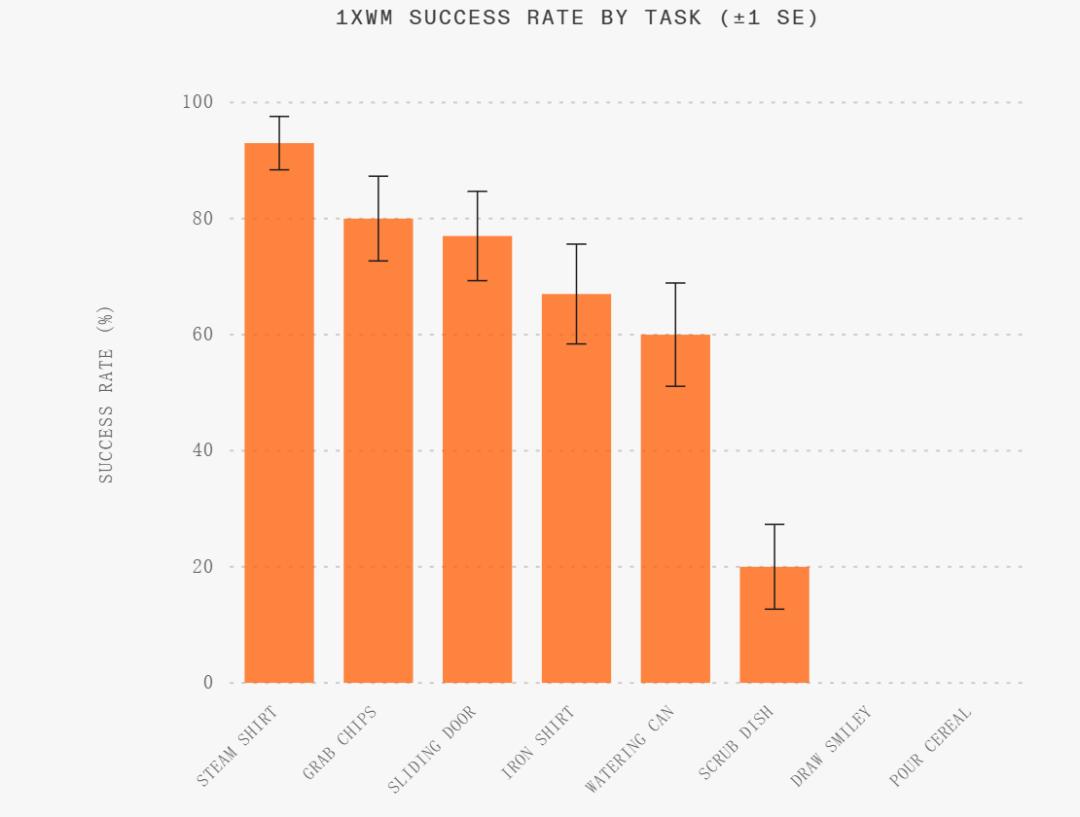 研究团队还通过系统性的实物实验评估了 1XWM 在分布内(ID)与分布外(OOD)任务上的表现。每类任务均重复执行 30 次。结果显示,1XWM 在多种动作原语上都保持了稳定的成功率,不过部分对精细操作要求较高的任务(例如倒液体、绘图等)仍然具有一定挑战性。