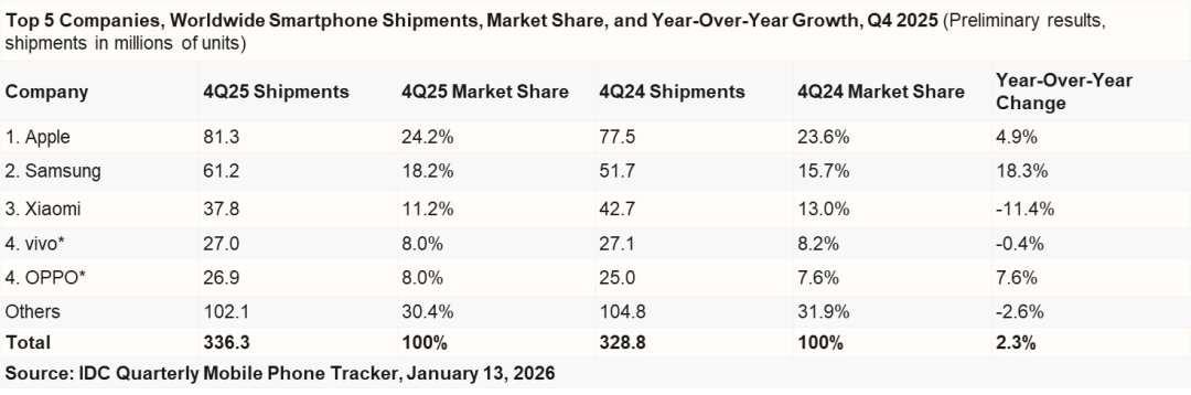 IT之家 1 月 14 日消息,IDC 今日(1 月 14 日)发布的《全球季度手机跟踪报告》初步数据显示,2025 年第四季度(4Q25)全球智能手机出货量同比增长 2.3%,达到 3.363 亿部。尽管受到存储芯片短缺的影响,市场仍在高端机型持续增长、折叠屏强劲表现以及消费者对未来涨价预期而提前换机的共同推动下实现增长。