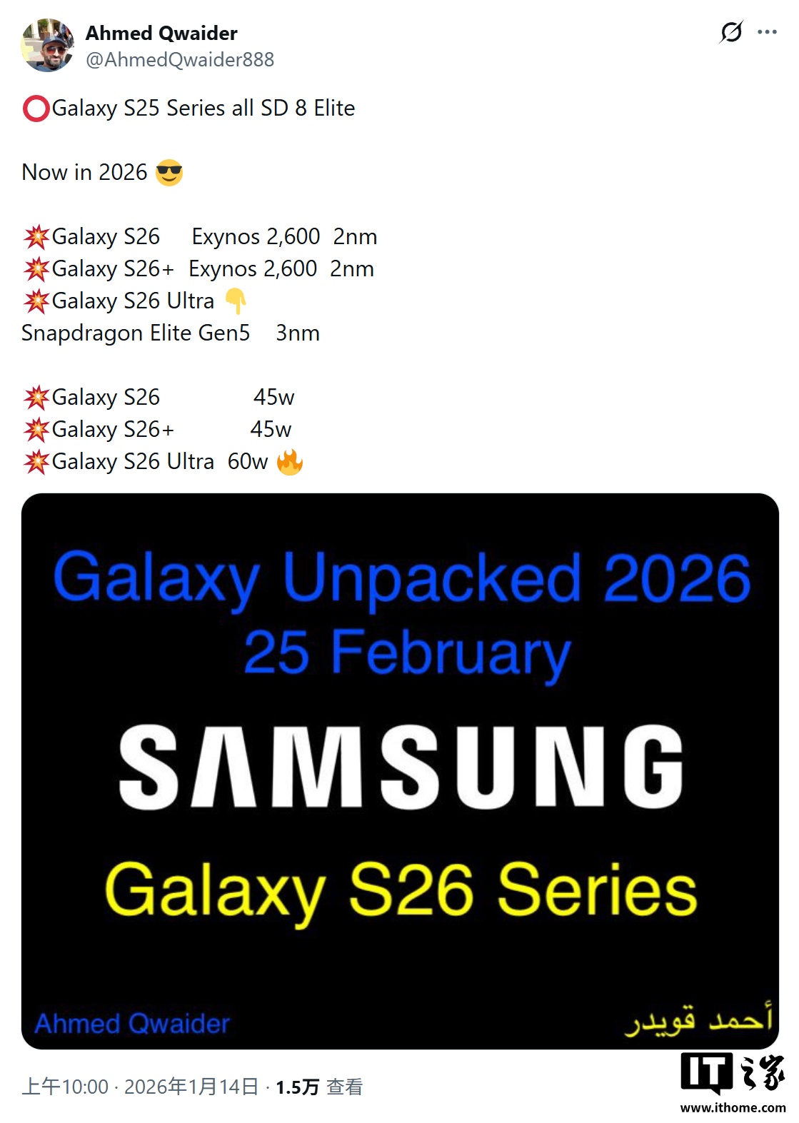 IT之家 1 月 14 日消息,消息源 Ahmed Qwaider 今天(1 月 14 日)在 X 平台发布推文,爆料称三星 Galaxy S26 和 Galaxy S26+ 两款机型支持 45W 有线充电,而 Galaxy S26 Ultra 旗舰机型支持 60W 有线充电。
