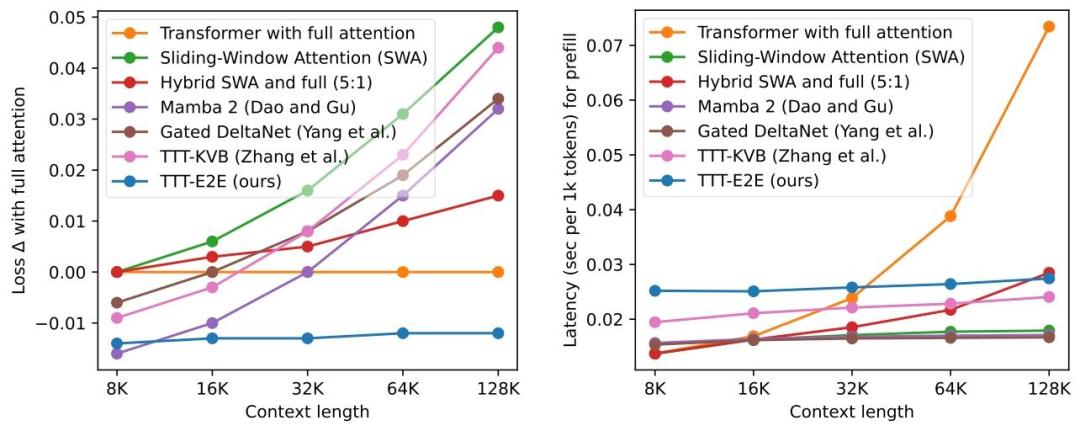 在3B参数模型的测试中,TTT-E2E在128K上下文长度下的测试损失与全注意力Transformer持平甚至更优,而Mamba 2、Gated DeltaNet等同类模型在长文本场景下性能均出现明显下滑;
