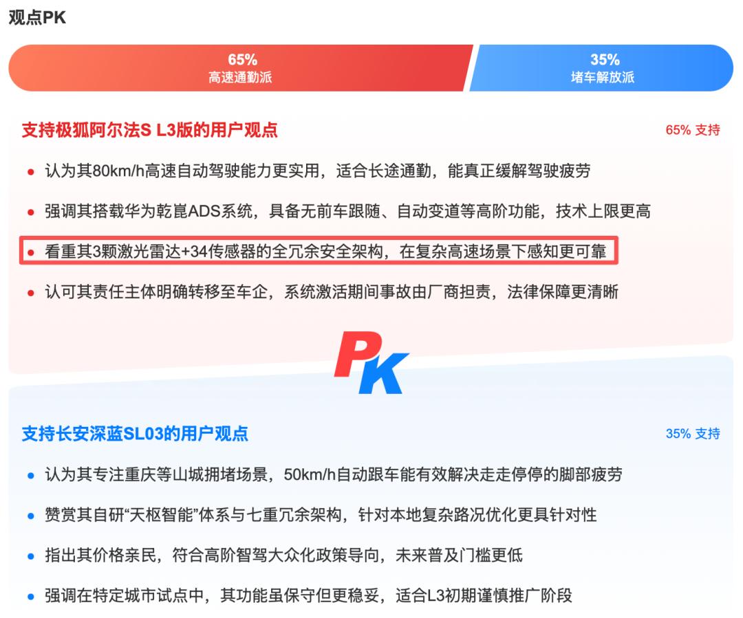 此次获批的两款车型便提供了有趣的对照:北汽极狐阿尔法S(L3版)搭载了包含3颗激光雷达在内的34颗高性能传感器,构建了感知、决策、制动、电源等全链路安全冗余;而长安深蓝SL03则采用了以视觉为主的方案。