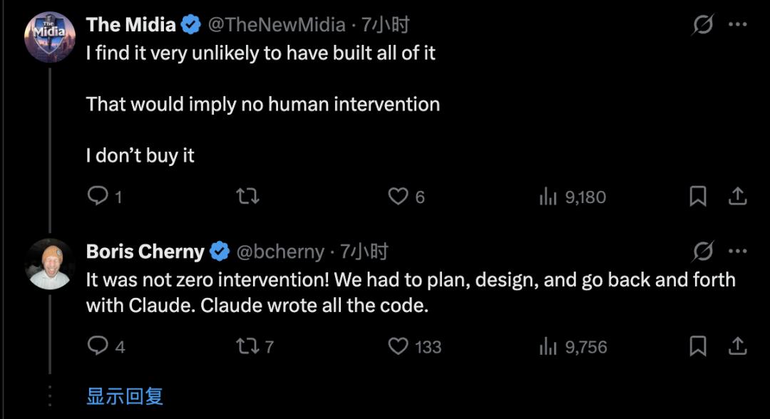不是说无人类干预,Claude Code负责人Boris Cherny确认,还需要人类来规划、设计、让AI反复尝试。