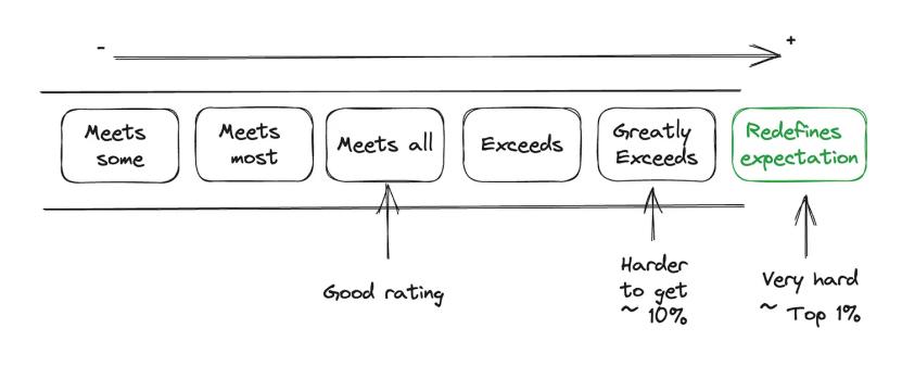 另一次是年终,相对复杂,有七个评级:重新定义预期(最高等级)、大幅超出预期、超出预期、完全达到预期、大部分达到预期、部分达到预期、未达到预期。