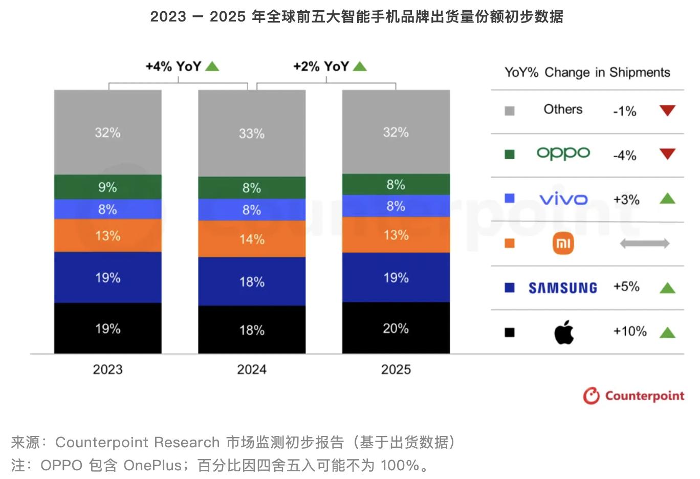 Counterpoint数据显示,在刚刚过去的2025年第四季度,智能手机出货量以相对温和的态势收官,受此前季度库存积压影响,同比仅增长1%。苹果以全球四分之一的出货量市场份额在该季度领先,创历史新高,三星以17%的市场份额位居次席。