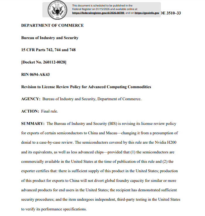这项监管规定标志着落实特朗普总统上个月允许英伟达和其他芯片制造商向中国出售先进人工智能处理器的决定迈出了关键一步。这与2022年开始实施的旨在阻止中国获取美国最强大技术的政策相比,标志着政策的重大转变。