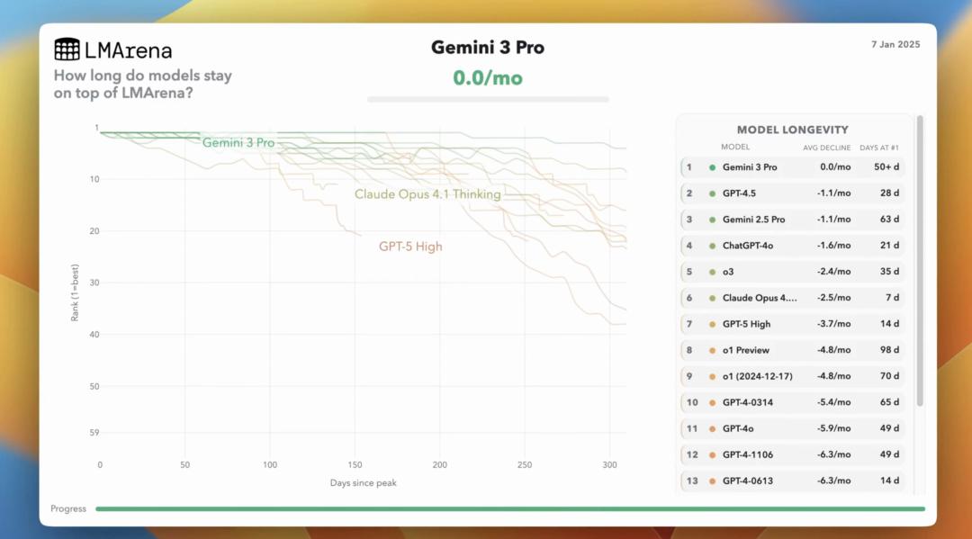 排名第一的模型平均只能保持约 35 天的领先地位,通常情况下会在 5 个月内跌出前五名,在 7 个月内跌出前十名。