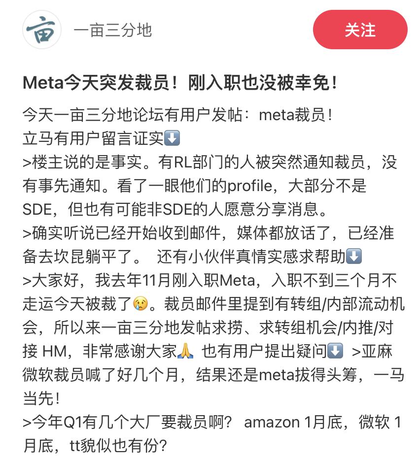 在知名海外华人社区当中,有被波及的Meta员工表示,自己是突然间就收到了裁员通知。