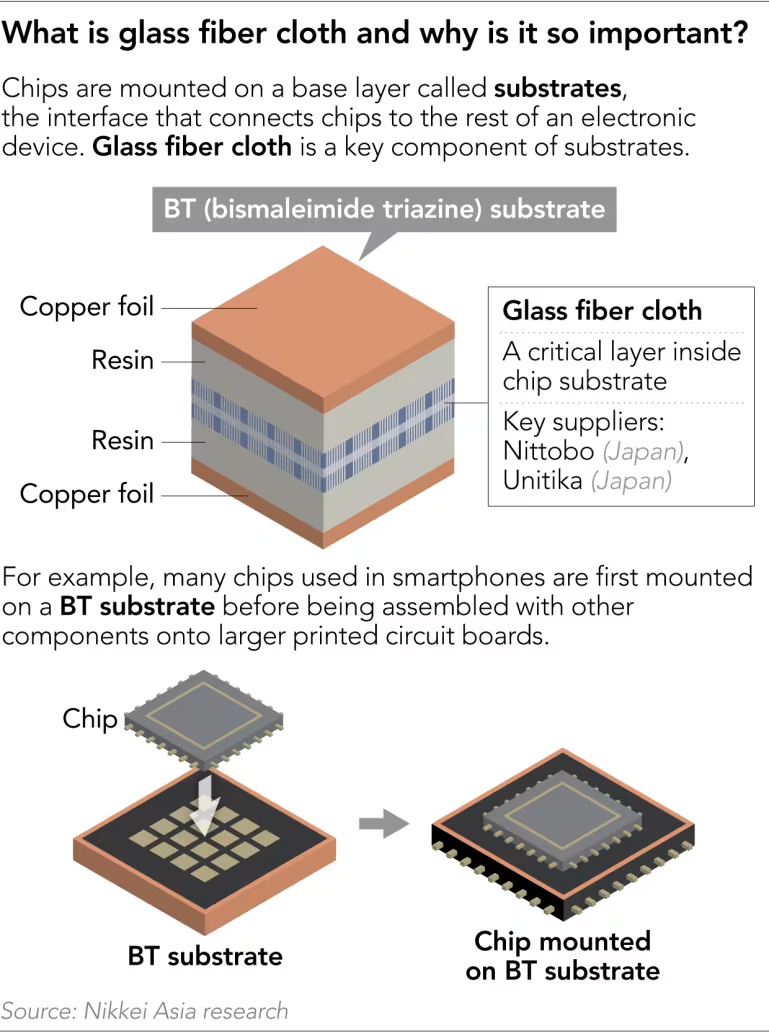 危机的根源在于供应链的高度集中。高端 T 型玻璃(T-glass)几乎由日本日东纺(Nittobo)一家公司垄断,这种材料因其高刚性和低热膨胀系数,对 AI 计算和高端处理器至关重要。