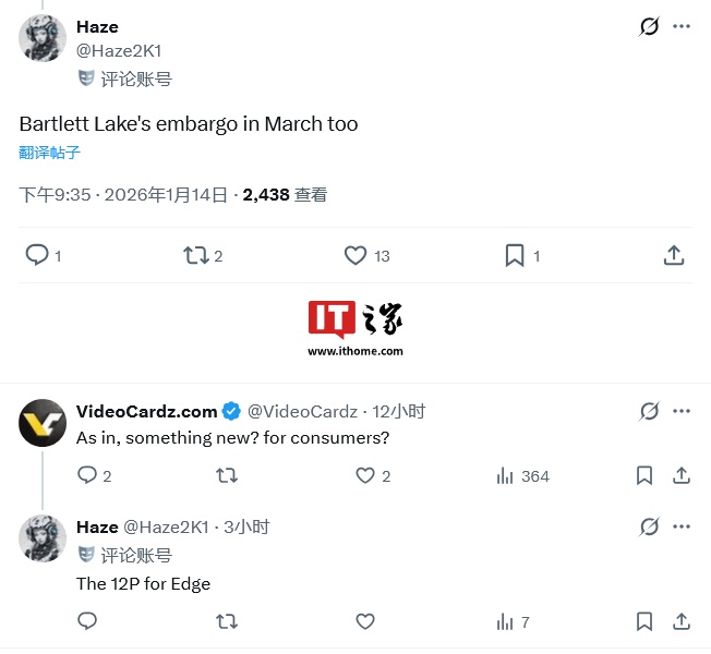 此外,另一位消息人士 @Haze2K1 表示,面向 NEX 边缘应用的 "Bartlett Lake 12P" 纯性能核处理器也将于今年三月解禁。