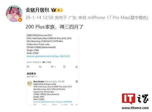 IT之家 1 月 15 日消息,消息人士 @金猪升级包 昨日对曝光的英特尔酷睿 Ultra 9 290HX Plus 与 290K Plus 处理器跑分记录表示,酷睿 Ultra 200 Plus "Arrow Lake Refresh" 处理器“得三四月了”。