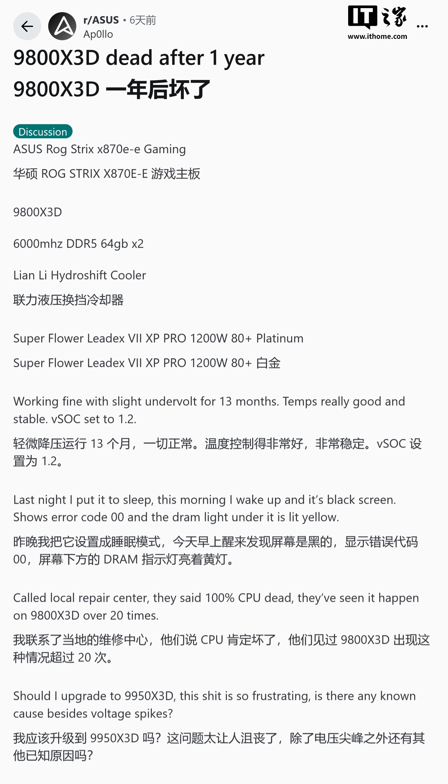 第二位用户使用 ROG Strix X870E-E Gaming 主板搭配 9800X3D 已近一年,期间一直使用旧版 BIOS 且运行稳定,却在近期突发故障。