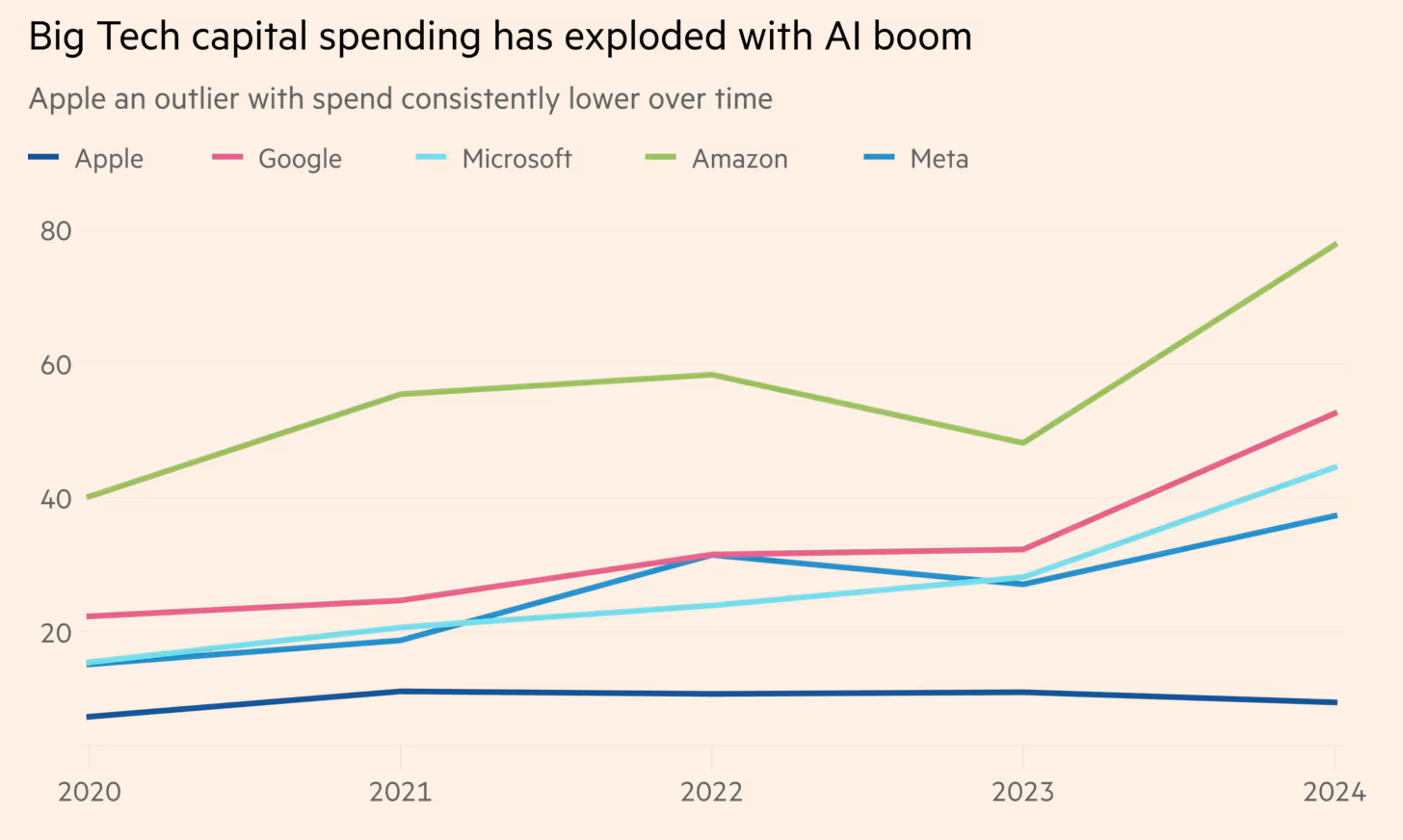 过去五年间,苹果始终将实体基础设施投资维持在营收的3%左右。相比之下,自2022年ChatGPT问世以来,谷歌、微软、亚马逊和Meta已承诺投入数千亿美元建设新的AI数据中心。