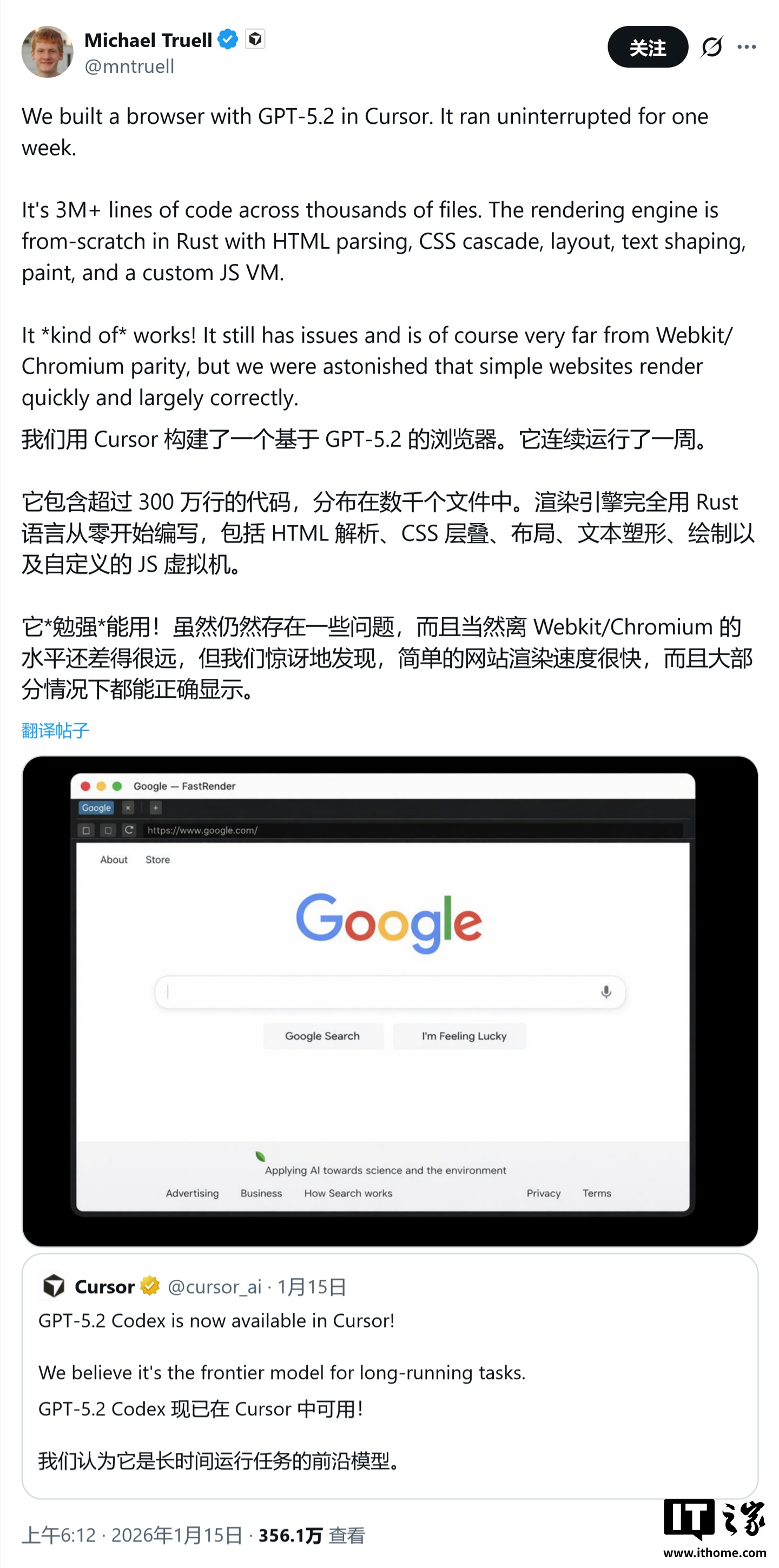 Cursor 首席执行官透露,这个浏览器并非简单的外壳,它包含一个完全用 Rust 语言编写的渲染引擎,具备 HTML 解析、CSS 级联与布局、文本渲染以及自定义 JavaScript 虚拟机等核心功能。这一成果有力证明了 GPT-5.2-Codex 已具备处理前沿级(Frontier-class)长期复杂任务的能力。