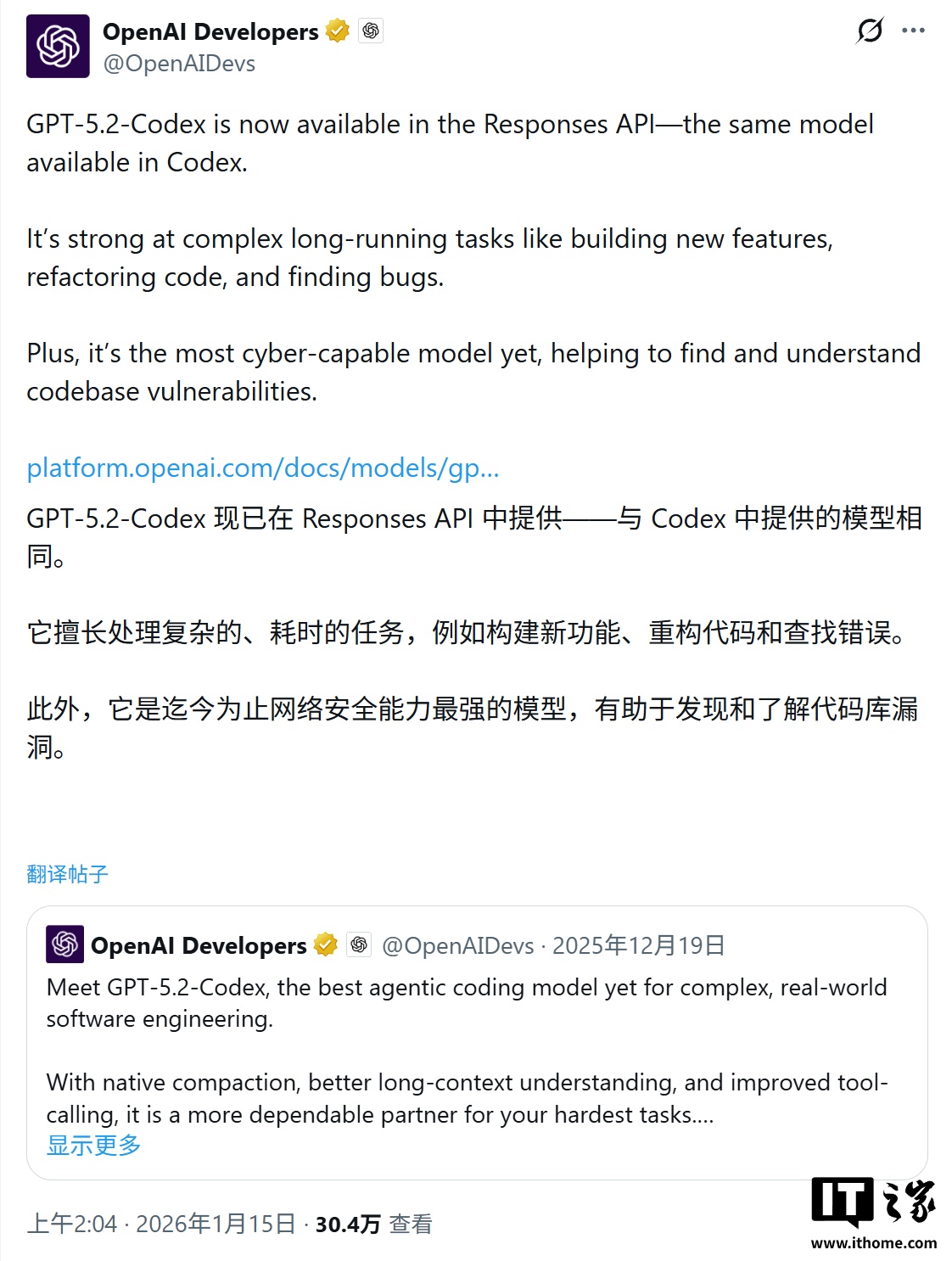 IT之家 1 月 16 日消息,OpenAI 公司昨日(1 月 15 日)在 X 平台发布推文,宣布通过 Responses API 方式,向开发者开放其最强代码模型 GPT-5.2-Codex。