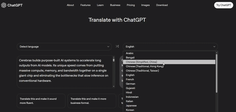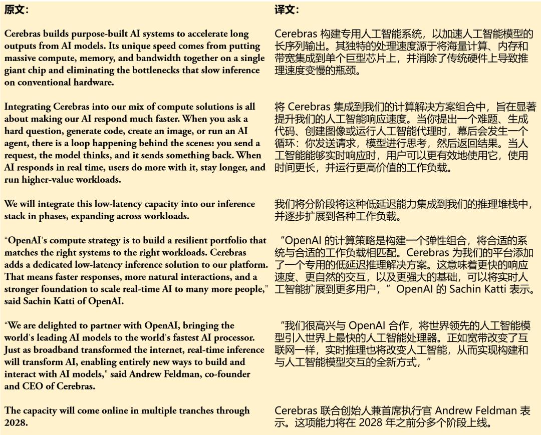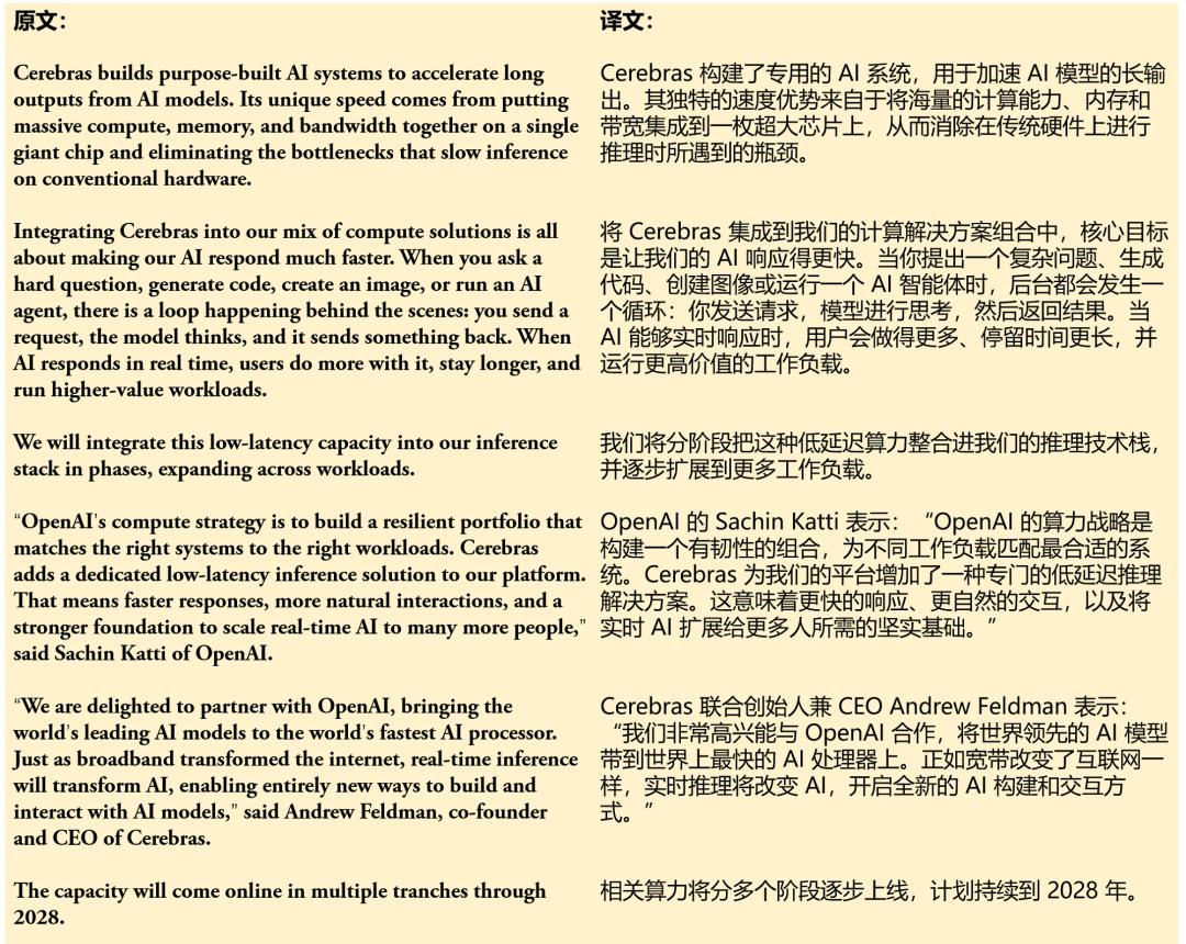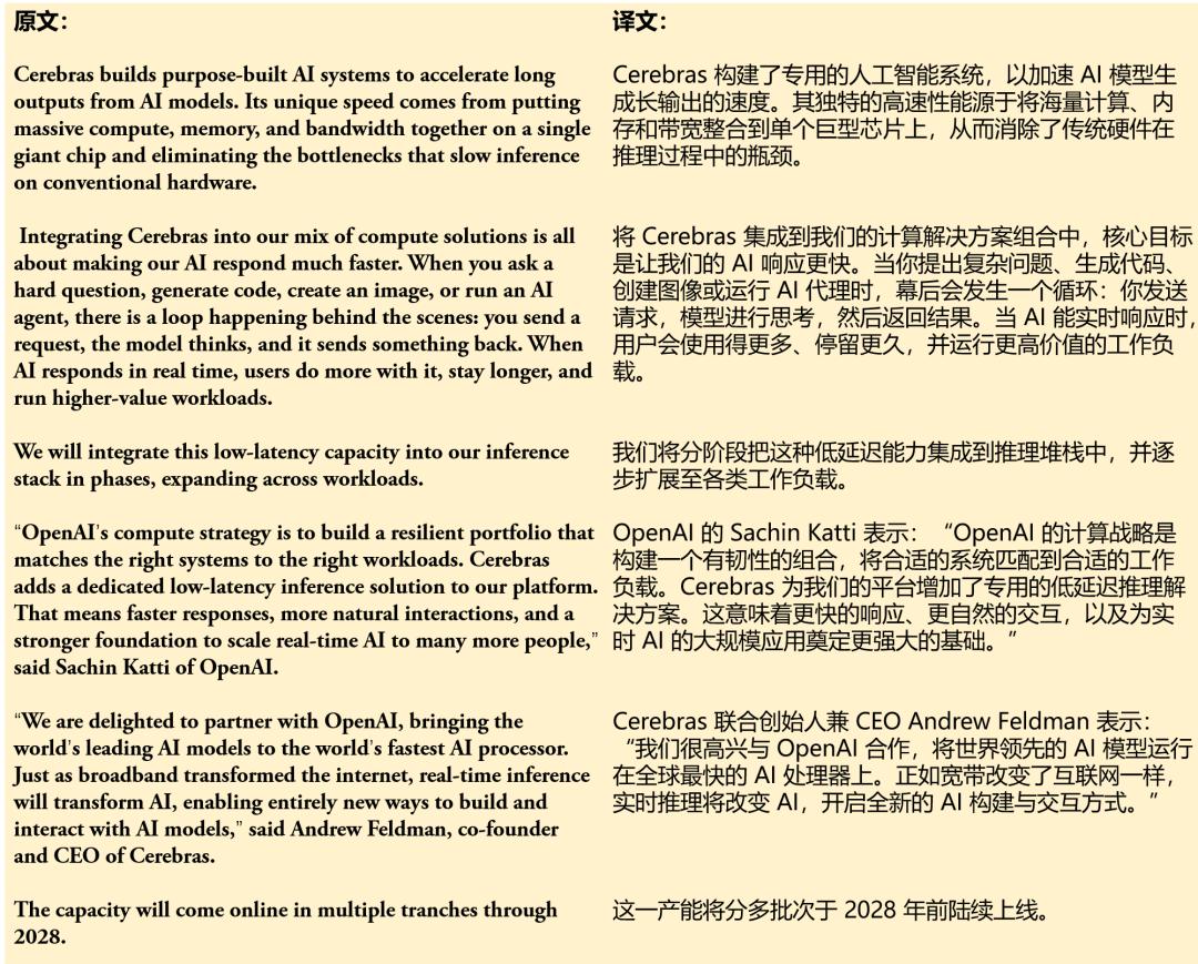 下方的文本来自OpenAI最近发布的一篇新闻稿,内容是OpenAI与AI芯片独角兽Cerebras建立合作关系。输入英文原文后,ChatGPT Translate用时不到5秒便给出了翻译结果。