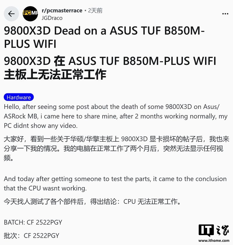 第三起案例则将风险范围扩大到了主流市场。用户 u/JGDraco 报告称,其搭载 ASUS TUF B850M-Plus WiFi 主板的电脑在稳定运行两个月后突然无法启动,经检查确认 Ryzen 7 9800X3D 已经损坏。
