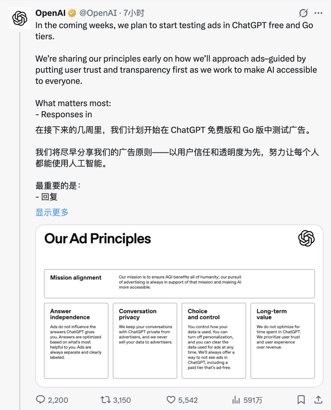 OpenAI 给出的理由很坦诚:引入广告是为了让更多人在免费或低门槛的情况下用上工具,毕竟昂贵的算力成本摆在那里,要实现「AI 普惠」的愿景,多元化的收入势在必行。