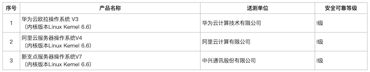 服务器操作系统中,华为云旗下华为云欧拉操作系统V3、阿里云旗下阿里云服务器操作系统V4、中兴通讯旗下新支点服务器操作系统V7首批通过测评。三大服务器操作系统的安全可靠等级均为I级。