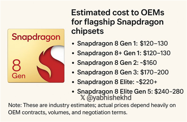 安卓阵营中,高通今年会有2nm工艺的骁龙8E6,具体成本未知,但去年3nm的骁龙8E5传闻成本在240到280美元之间,今年随便涨点恐怕就要300美元了,比苹果A20还高,毕竟骁龙芯片还要集成高性能基带芯片。
