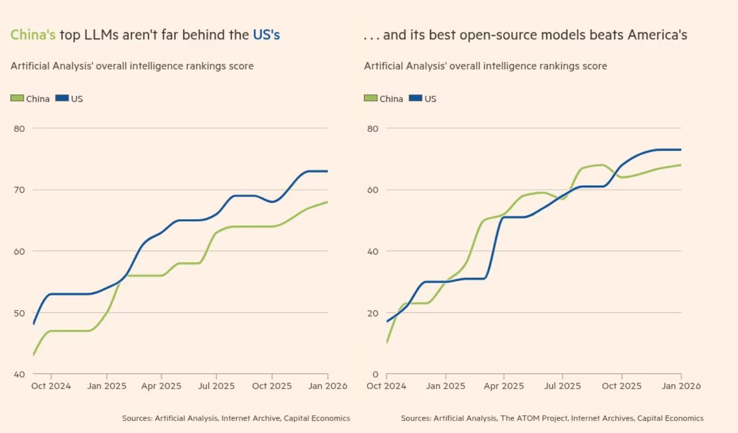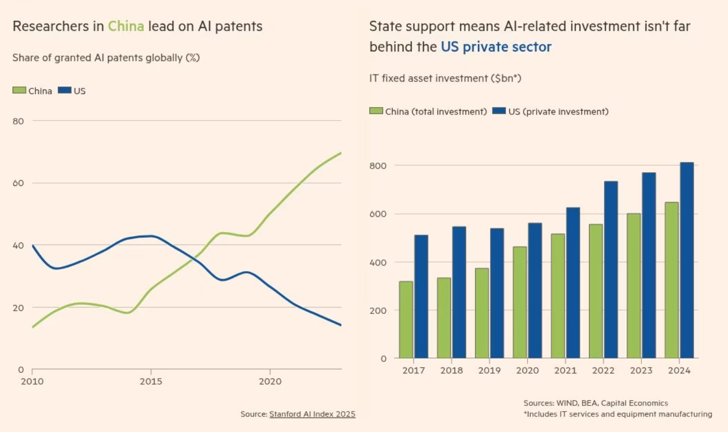 目前,这两大超级大国似乎在进行不同类型的竞赛。美国凭借高额投资、优质芯片和专有生态系统,或更有可能在“打造最强模型”的短跑中胜出。中国则更擅长将“足够好”的模型融入实际应用中,并推动其全球普及。