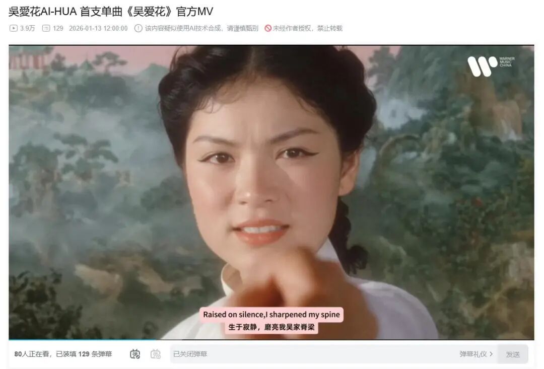 1月13日,一支名为《吴爱花》的AI MV在B站、小红书等平台上线,凭借其80年代香港邵氏武侠电影质感的画面与高完成度的演唱,迅速引起了一些网友关注。据悉,“吴爱花”由华纳音乐中国与新媒体艺术家吴志气合作创作,可灵AI提供了该新曲MV的技术支持。