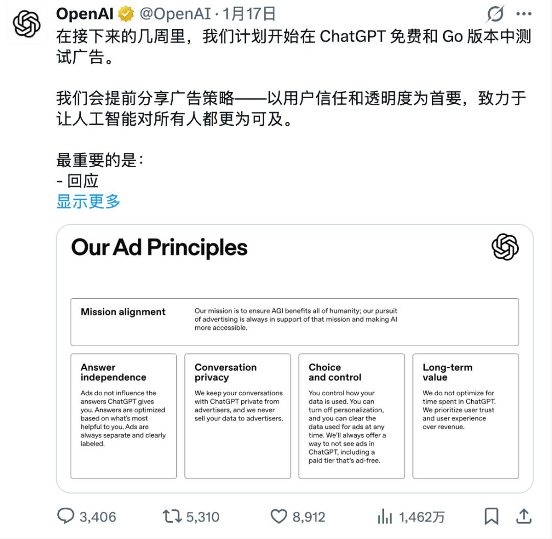 根据OpenAI官方博客的说法,广告对象是免费用户和Go订阅用户——Go是新推出的订阅套餐,每月8美元,而Plus、Pro、Business和Enterprise用户不会看到广告。